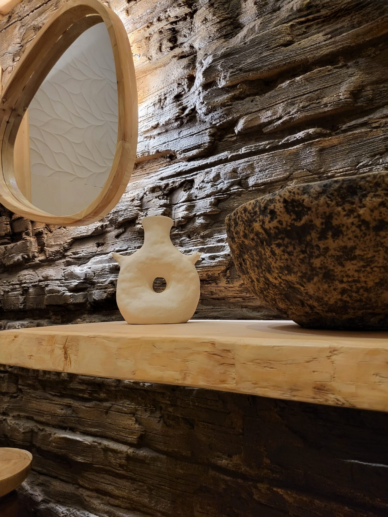 Empleamos madera reciclada, piedra natural y otros materiales sostenibles para crear espacios cálidos y acogedores.